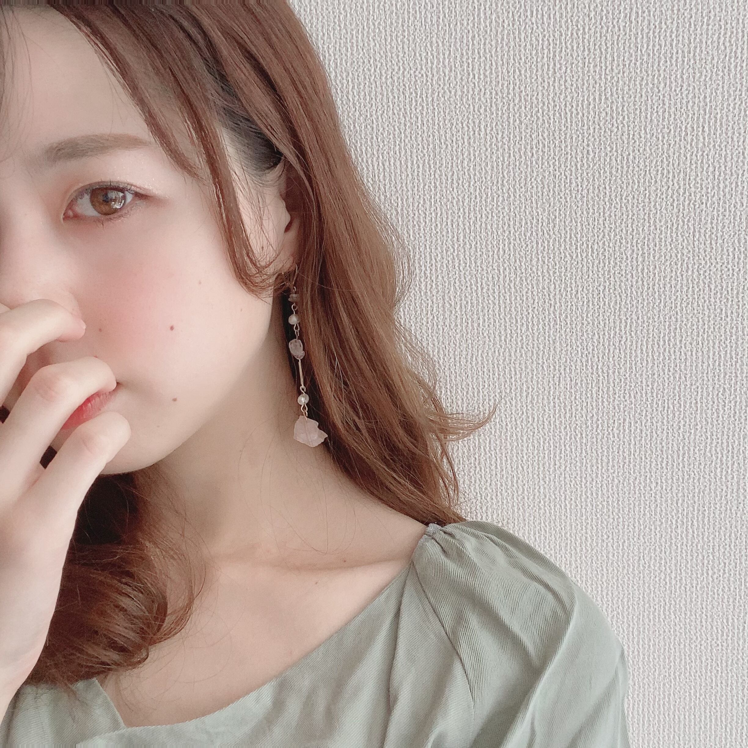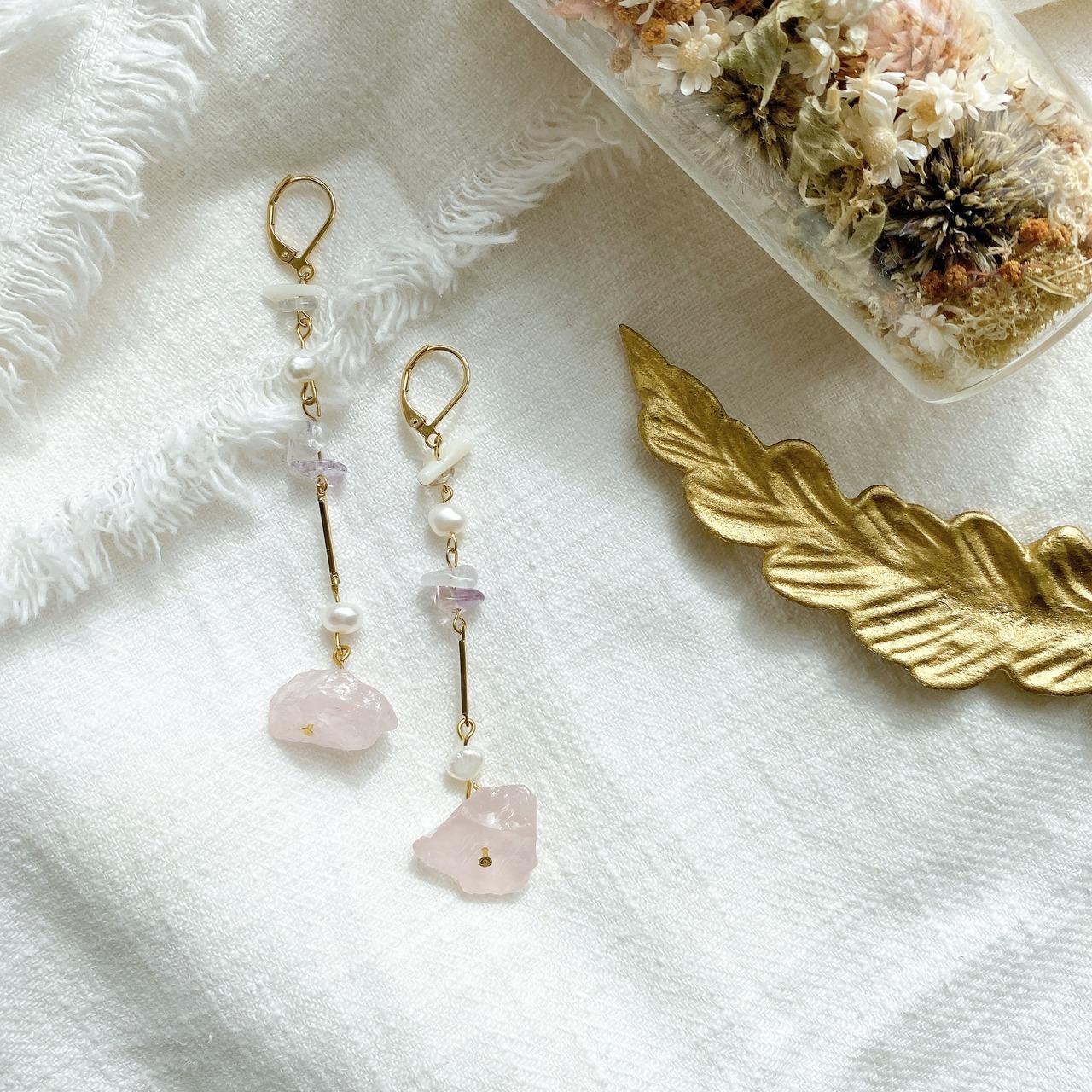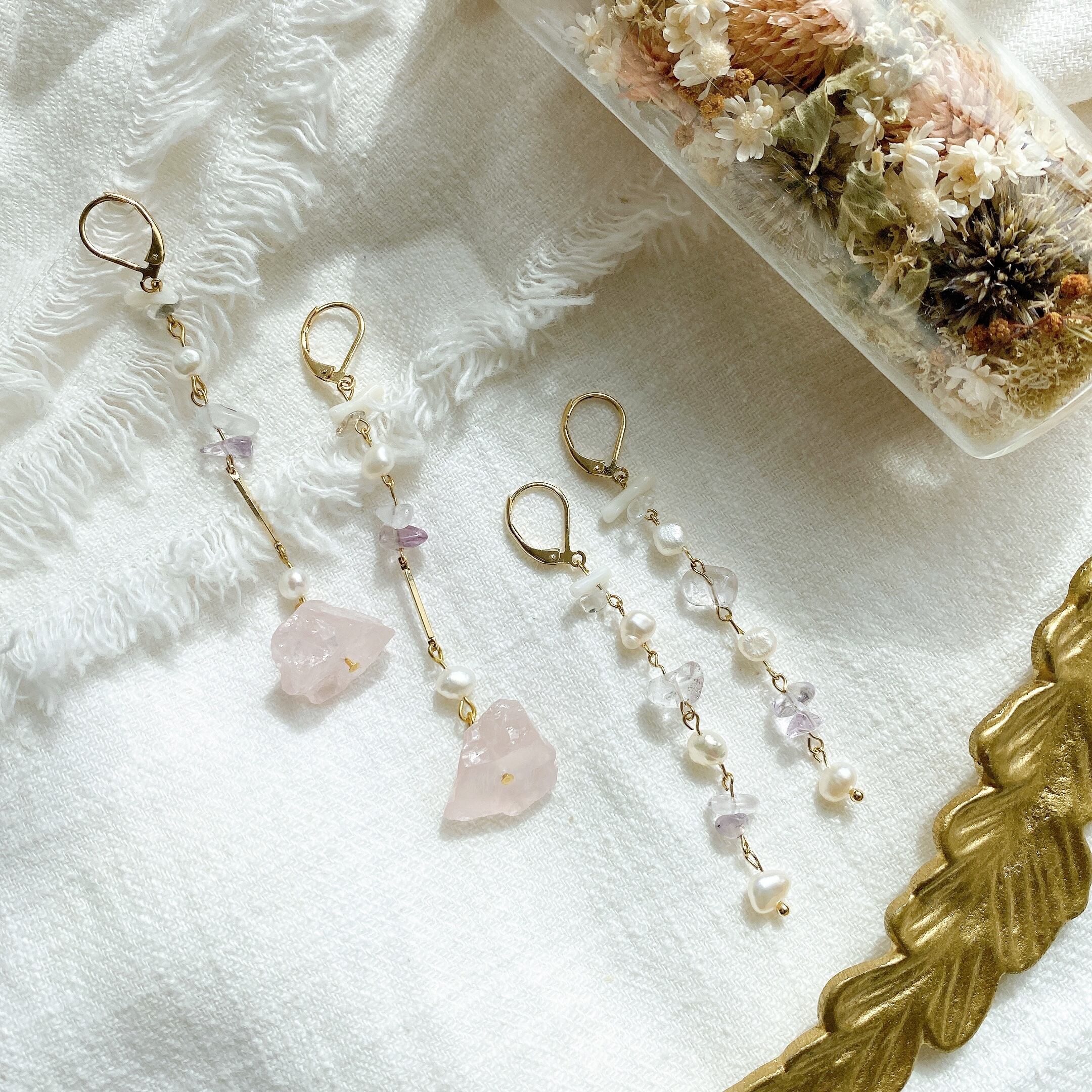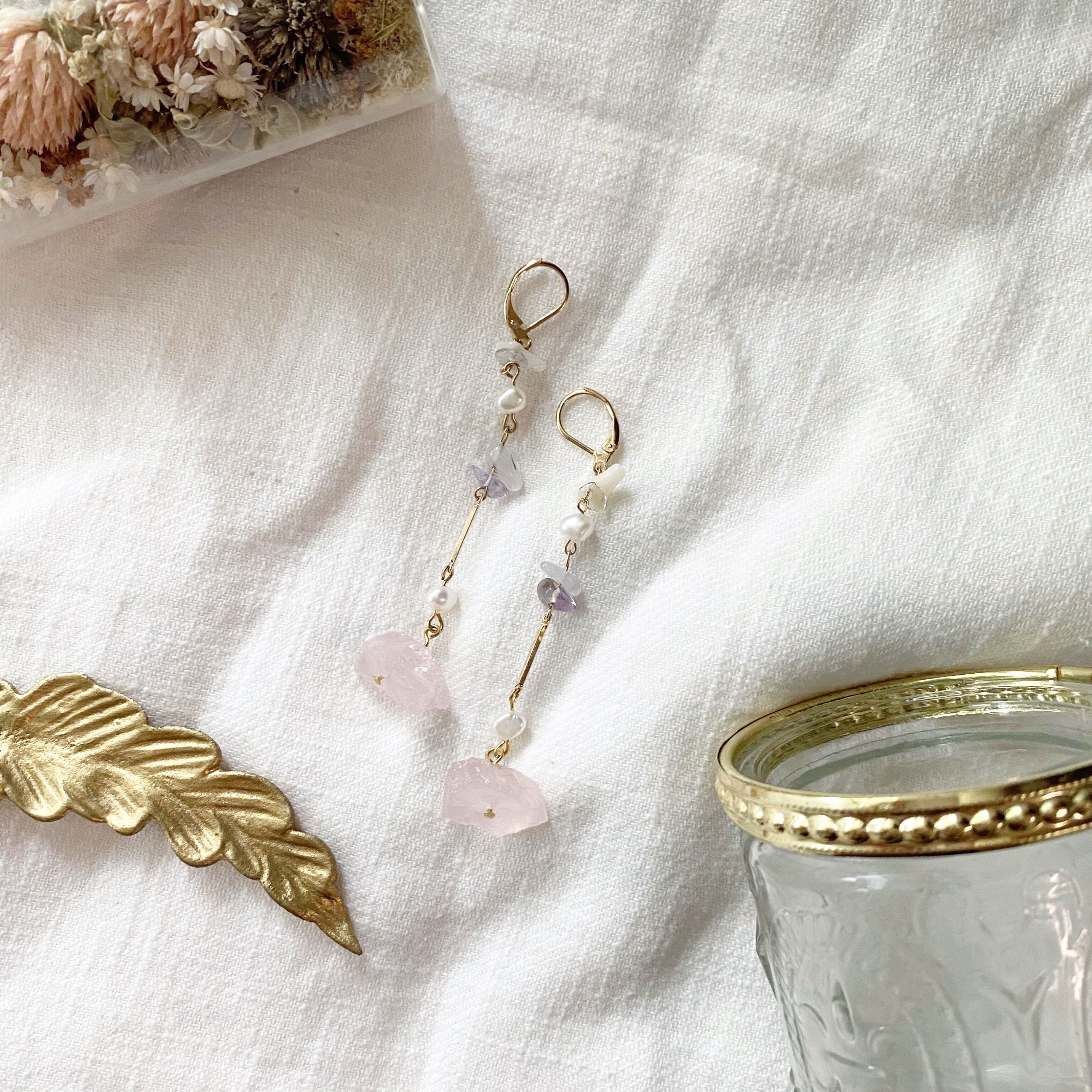 柔らかいピンクカラーの天然石を組み合わせたフックピアス✳︎